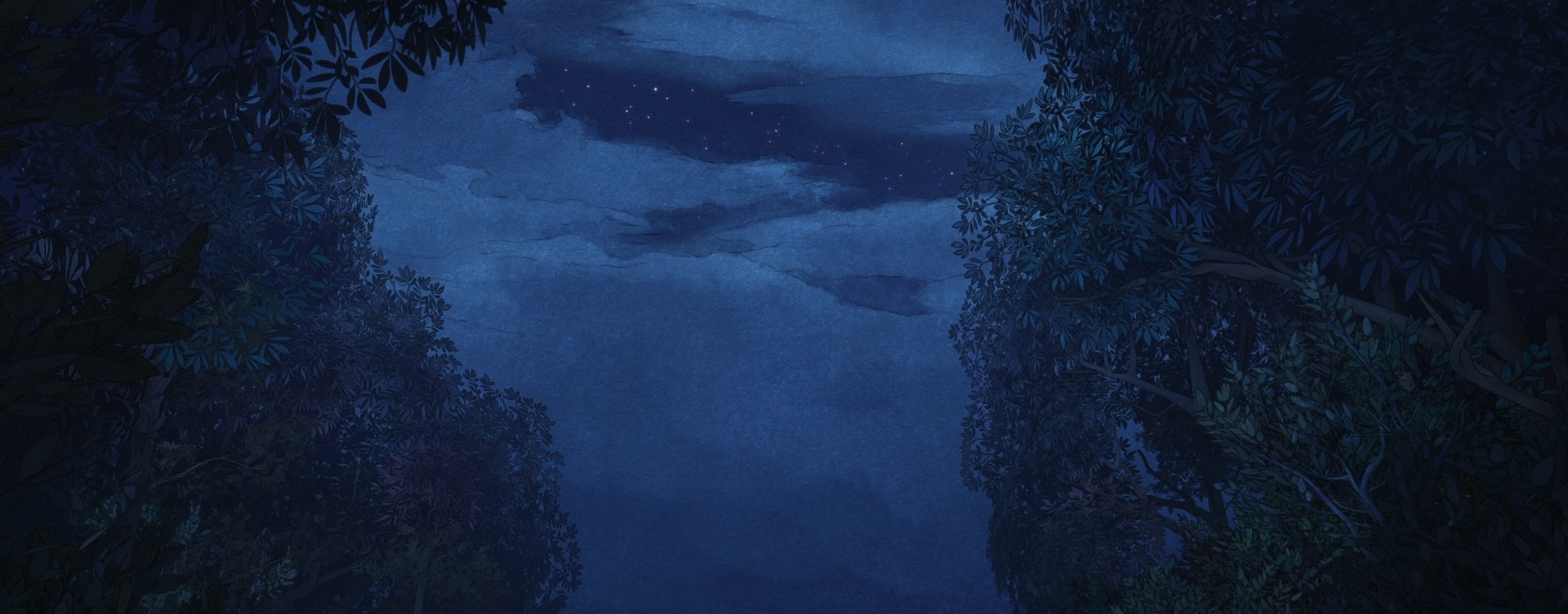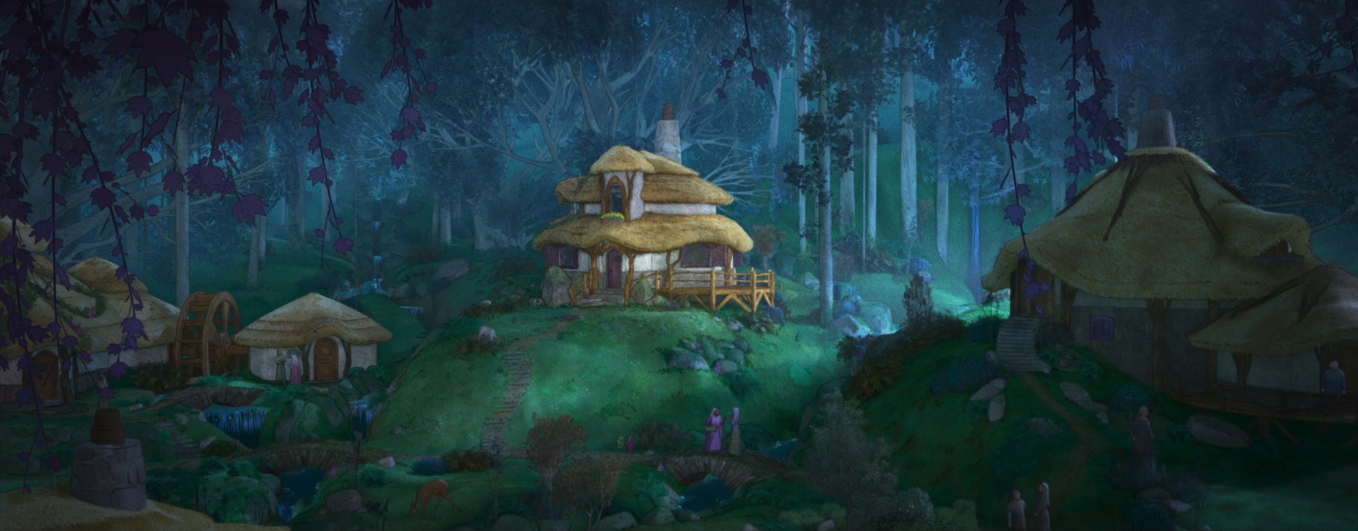 An early breakthrough in achieving Wish’s style was finding that combining Kuwahara filters1 [Kuwahara et al. 1976] with linework generated from the renderer created a convincing starting point for a line-on-watercolor look that could use the renderer’s physical lighting as a starting point, instead of needing to construct stylized lighting entirely from scratch in comp on top of flat-shaded unlit renders. To help really tie together the watercolor look, early tests put the entire image on a watercolor paper texture background, but once we tested the watercolor paper texture background in motion, some issues became apparent. With just a static watercolor paper texture background, the illusion of motion broke as animation looked like it was “swimming” through the texture, but simply texturing everything with watercolor textures in 3D space looked downright bizarre since it looked less like the frame was a watercolor painting and more like all of the characters and the environment were made out of paper. To solve this problem, the Hyperion team invented a new dynamic screen space texture technique [Burley et al. 2024] where the renderer would project screen space textures onto 3D surfaces while tracking motion vectors. The result is that Wish’s watercolor backgrounds look like just a flat sheet of watercolor paper when still, but under motion convincingly move with the characters while neither looking like they’re actually in 3D space nor looking disconnected from motion.
