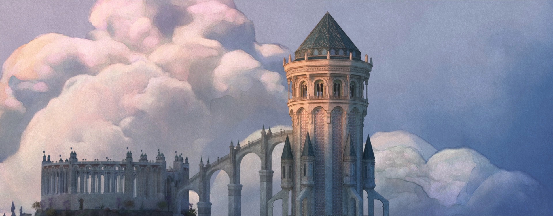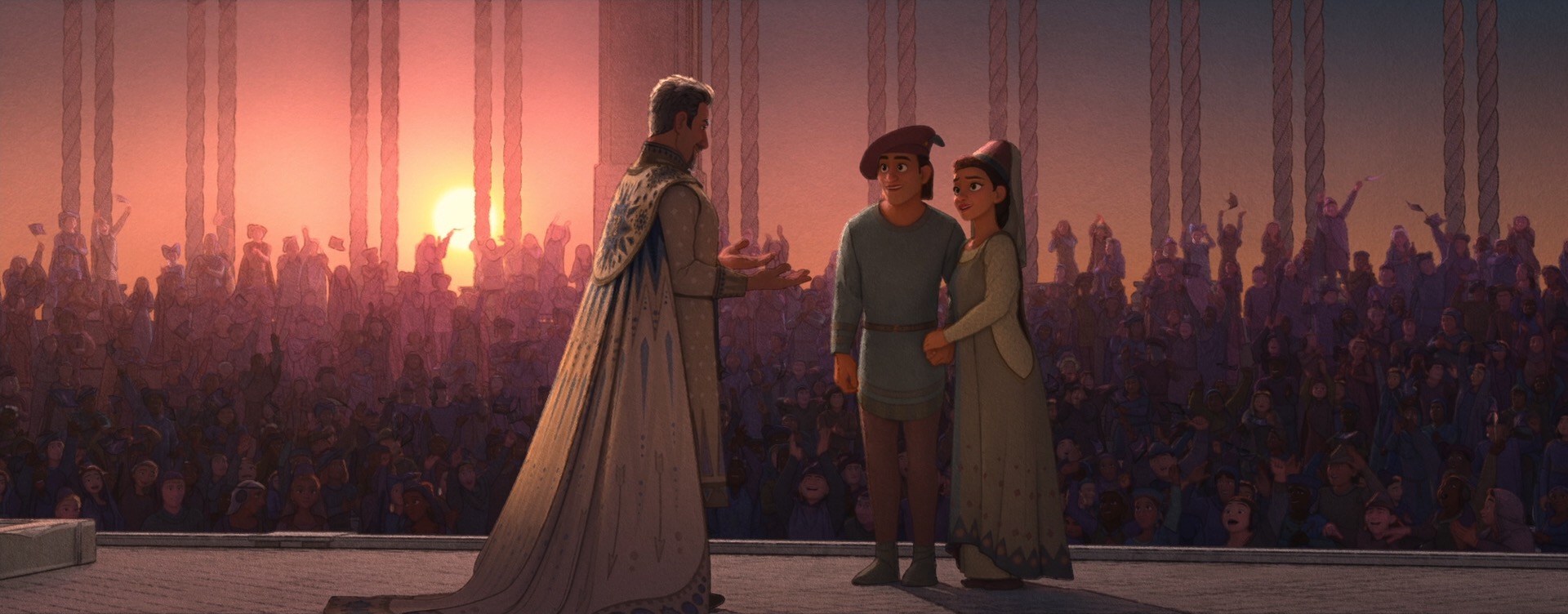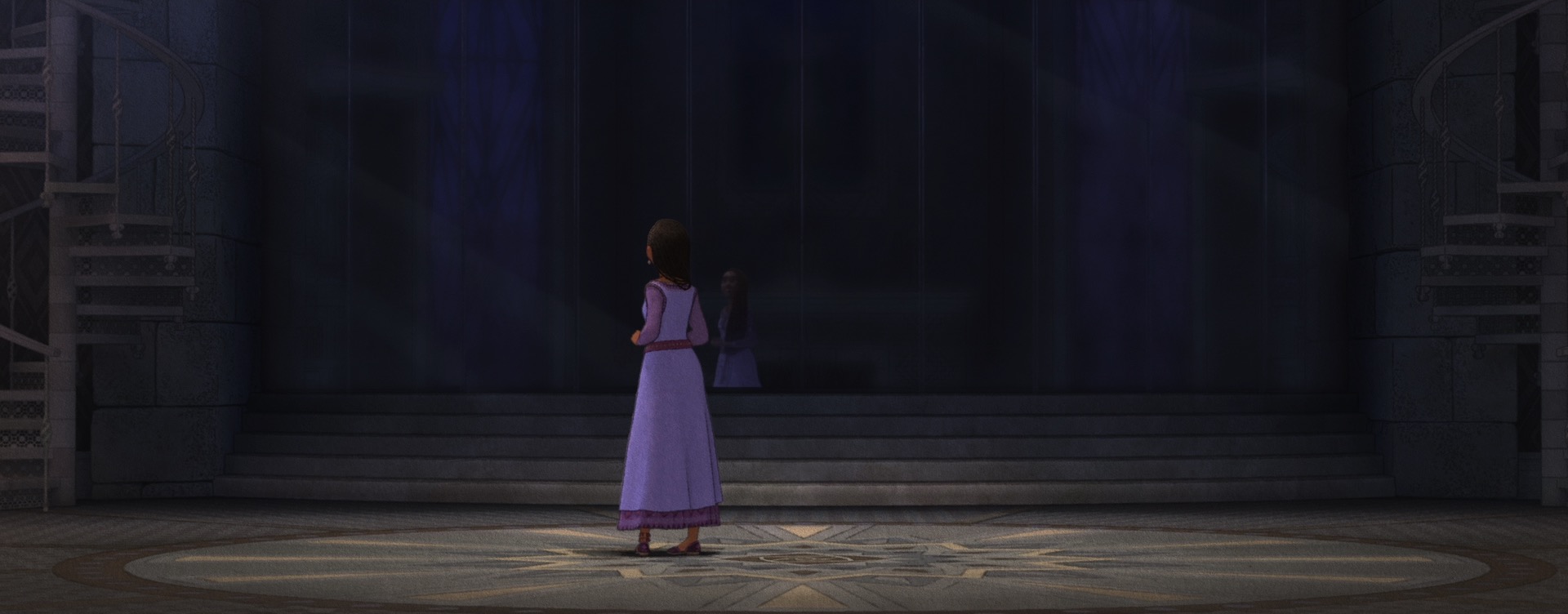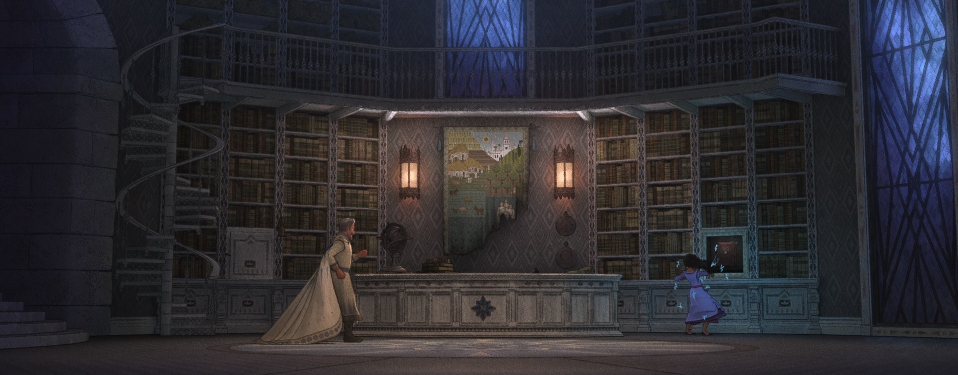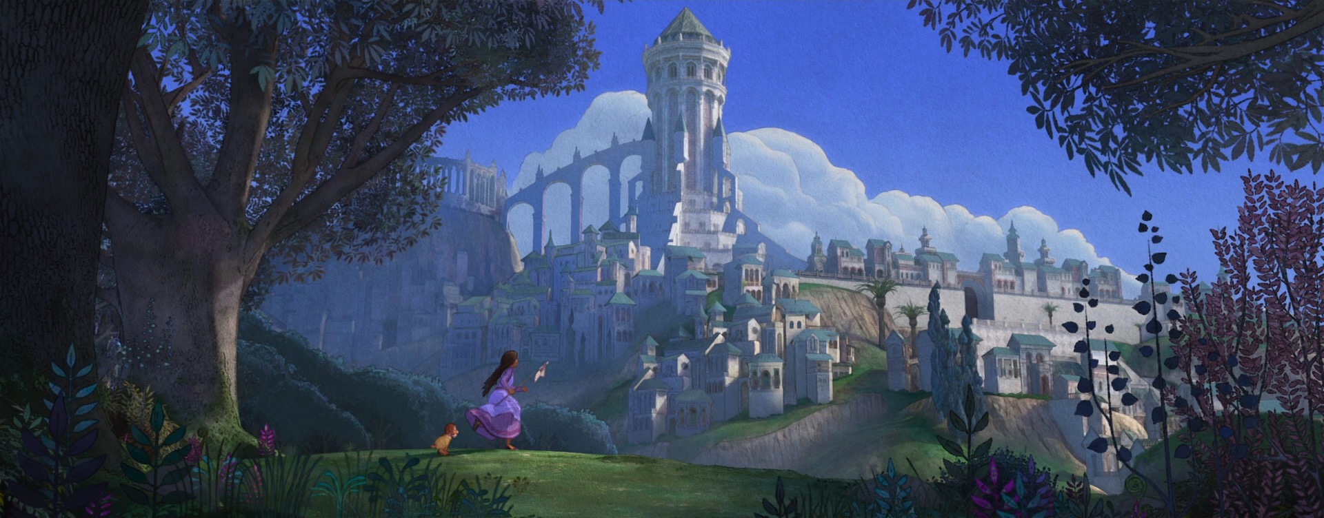 The decision to give Wish a unique style came from pretty much the very beginning of the project; the studio wanted to do something special for the 100th anniversary film to tie together our modern way of making animated films with the studio’s rich hand-drawn heritage. The look of Wish is especially influenced by early 20th century Disney traditional watercolor animation, with Snow White and the Seven Dwarfs (1937) and Sleeping Beauty (1959) being the largest guideposts. This influence extends all the way to the very shape of the film, so to speak- Wish is the first CG film that Disney Animation has made in the ultrawide 2.55:1 Cinemascope-style aspect ratio, matching the aspect ratio that was used on Sleeping Beauty and Lady and the Tramp (1955). This aspect ratio choice meant that stylization on Wish even impacted layout, since they had to think about how to frame for such an ultrawide image!