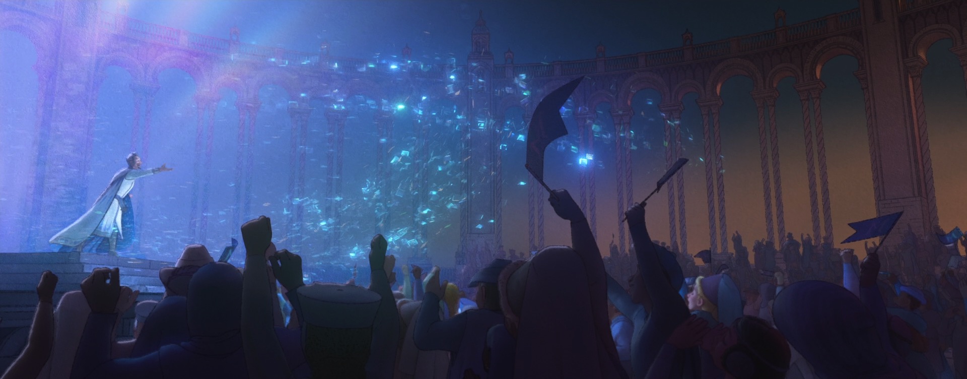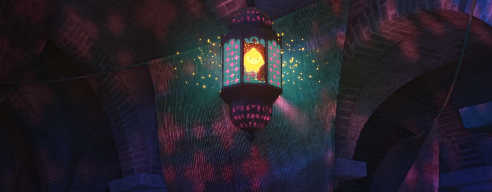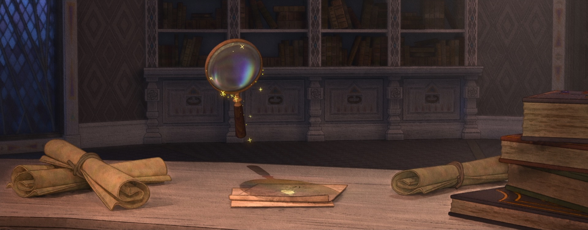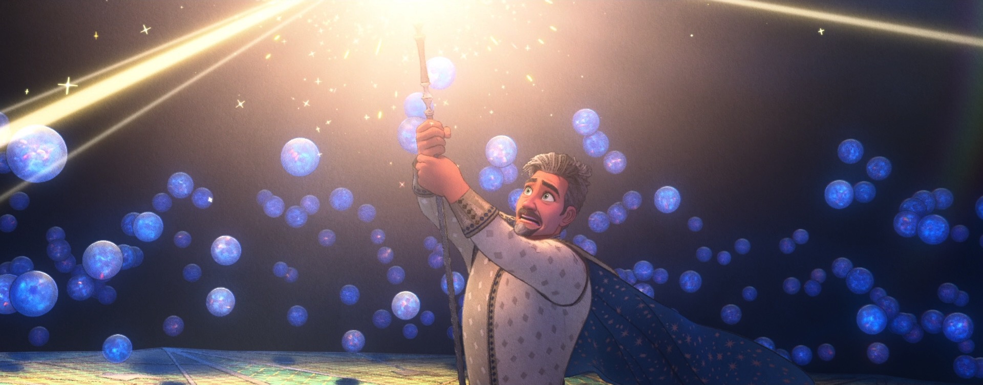 There were actually also some more traditional physically based rendering problems to solve on Wish too, which one might not necessarily expect for such a stylized film. For some of Magnifico’s magic, the art-direction called for a sort of prismatic look where white light would get split into different colors. We decided to try to achieve this effect through physically based shading, since the starting point for Wish’s entire stylization pipeline was renders with physical lighting in order to provide consistency. To achieve this effect through physically based shading, I extended the Disney BSDF with spectral dispersion support (retrofitting a spectral effect into a non-spectral renderer was a fun challenge worth discussing on its own someday). Once our lookdev artists had access to dispersion within the Disney BSDF, it was fun seeing all of the other places where they started sprinkling the effect in, such as in various glass objects.