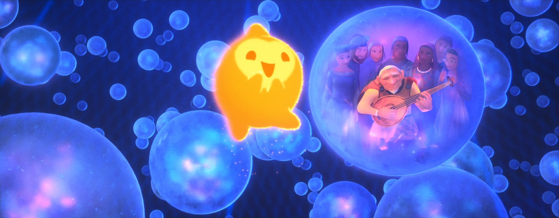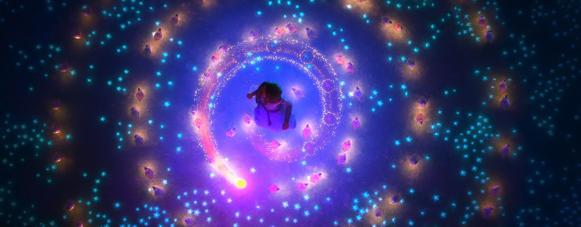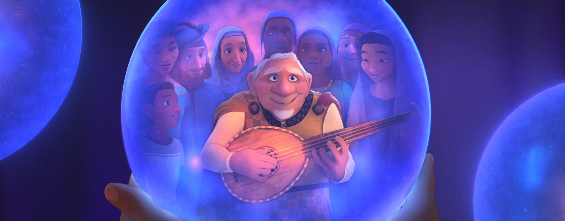 Stylization on Wish didn’t just mean new renderer effects and lighting and compositing work; in order to make characters read correctly in a watercolor look, stylization had to be incorporated into all of the characters at a geometric and design level as well, and had to be incorporated into animation and simulation. As an example: a core story device in Wish is the collective wishes of Rosas, which take the form of orbs containing entire small worlds set inside of swirling volumetrics. Creating these wishes required clever pipeline solutions to embed entire stylized animated scenes inside of the orbs in 3D space, which was used instead of a usual compositing-based insert-shot workflow or the teleport-based solution [Butler et al. 2022] used on Encanto; this approach was taken in order to provide animators with the ability to sync and see fully combined shots interactively and to simplify the rendering setup needed for stylization in lighting and compositing [Karanam et al. 2024]. On top of creating the individual wishes, huge numbers of wishes then had to be choreographed into tight, closely synchronized formations to meet the art-direction and shape language of the songs they were a part of, which required developing new crowd rigs and animation controls. The rendering aspect of the wishes was in a lot of ways actually the easy part! Each wish was also an internally emissive object, so when thousands of wishes are massed together in key sequences in the movie, we initially had some concerns about efficiently rendering all of the wishes, but our long-standing cache points many-light selection strategy [Li et al. 2024c] proved to be more than capable for the task.