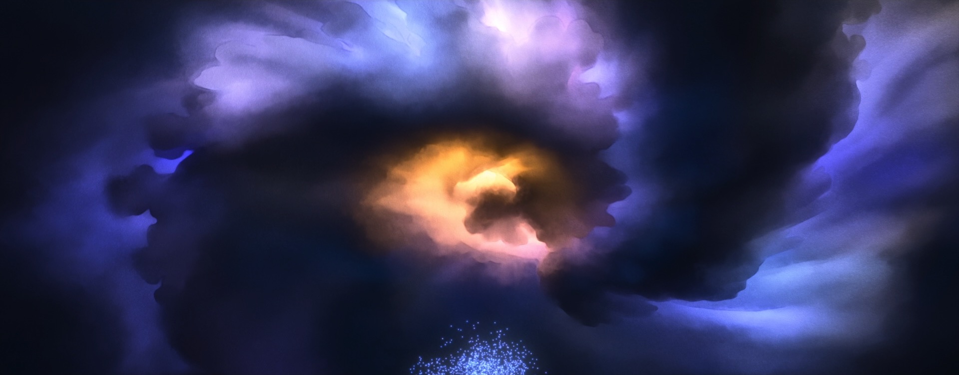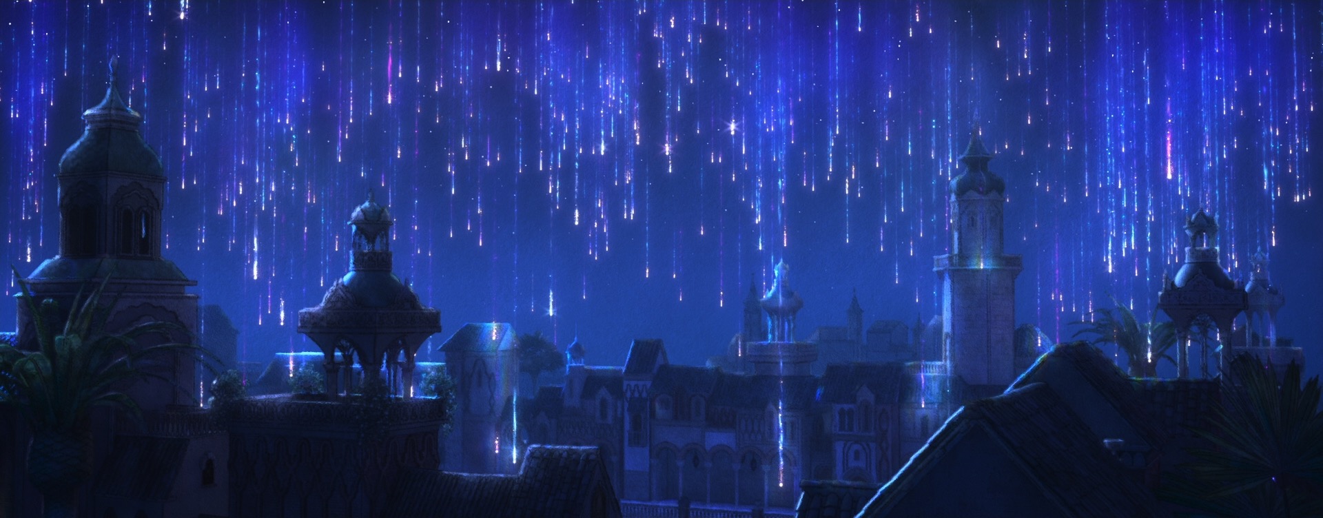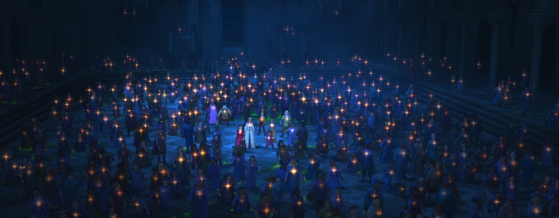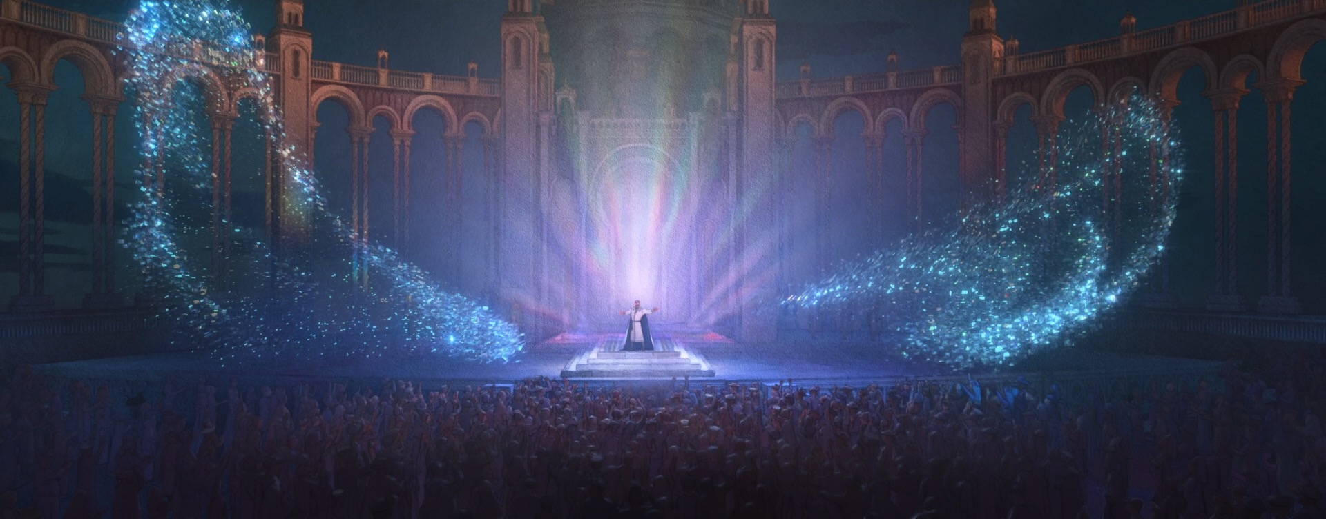 Stylization on Wish didn’t just mean new renderer effects and lighting and compositing work; in order to make characters read correctly in a watercolor look, stylization had to be incorporated into all of the characters at a geometric and design level as well, and had to be incorporated into animation and simulation. As an example: a core story device in Wish is the collective wishes of Rosas, which take the form of orbs containing entire small worlds set inside of swirling volumetrics. Creating these wishes required clever pipeline solutions to embed entire stylized animated scenes inside of the orbs in 3D space, which was used instead of a usual compositing-based insert-shot workflow or the teleport-based solution [Butler et al. 2022] used on Encanto; this approach was taken in order to provide animators with the ability to sync and see fully combined shots interactively and to simplify the rendering setup needed for stylization in lighting and compositing [Karanam et al. 2024]. On top of creating the individual wishes, huge numbers of wishes then had to be choreographed into tight, closely synchronized formations to meet the art-direction and shape language of the songs they were a part of, which required developing new crowd rigs and animation controls. The rendering aspect of the wishes was in a lot of ways actually the easy part! Each wish was also an internally emissive object, so when thousands of wishes are massed together in key sequences in the movie, we initially had some concerns about efficiently rendering all of the wishes, but our long-standing cache points many-light selection strategy [Li et al. 2024c] proved to be more than capable for the task.