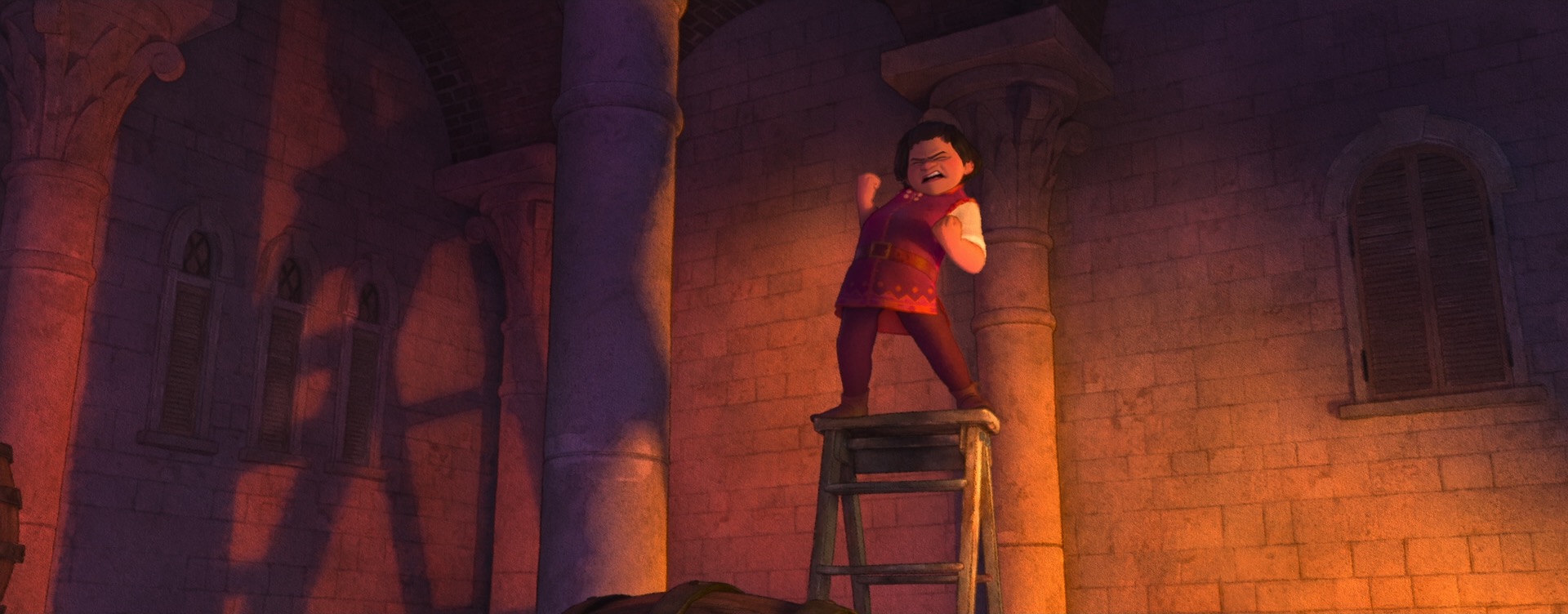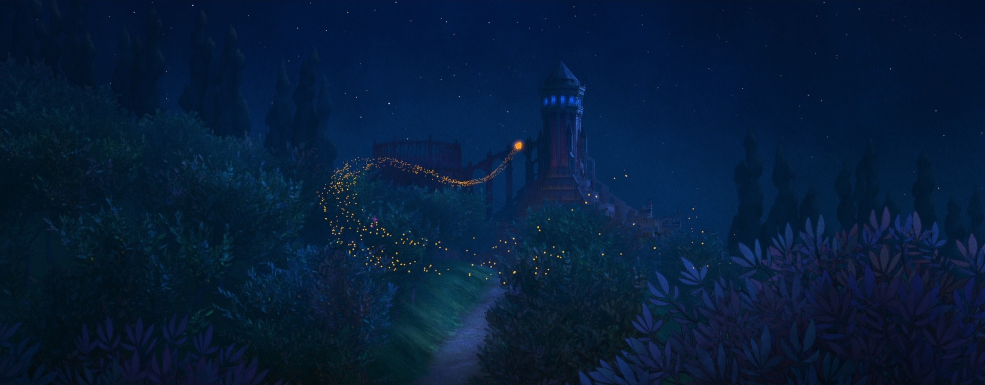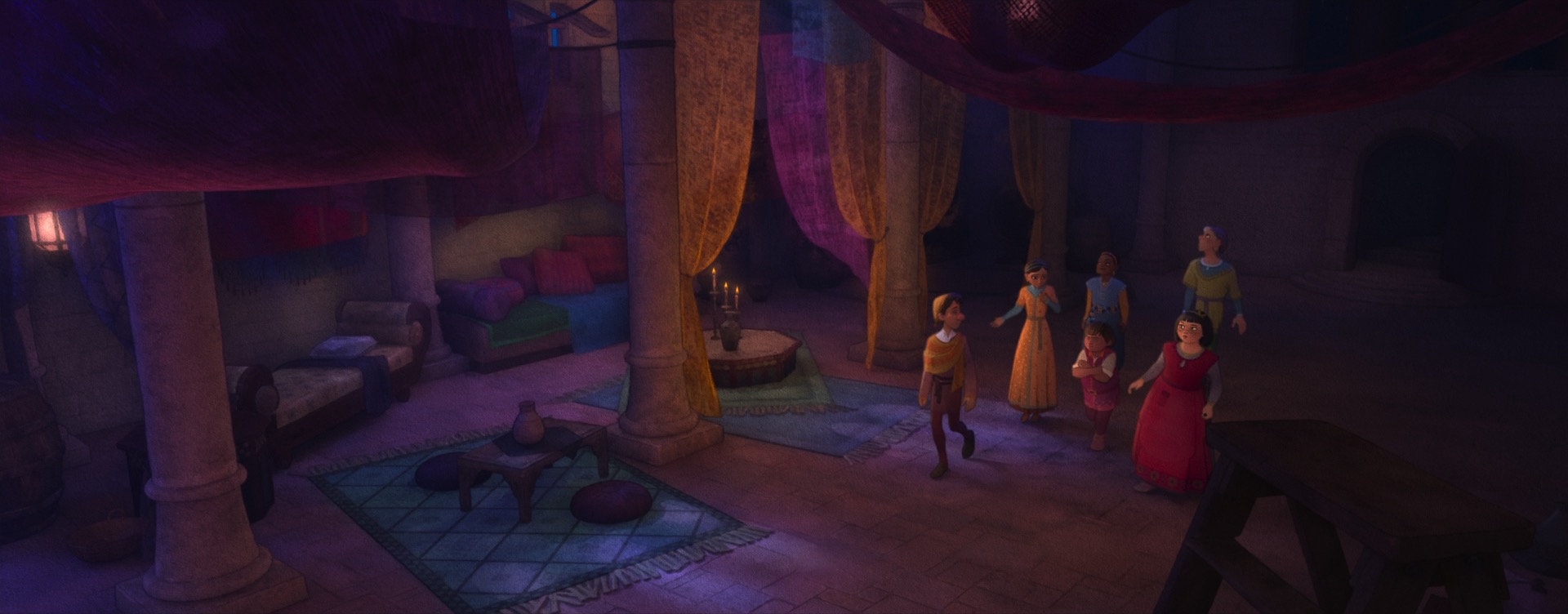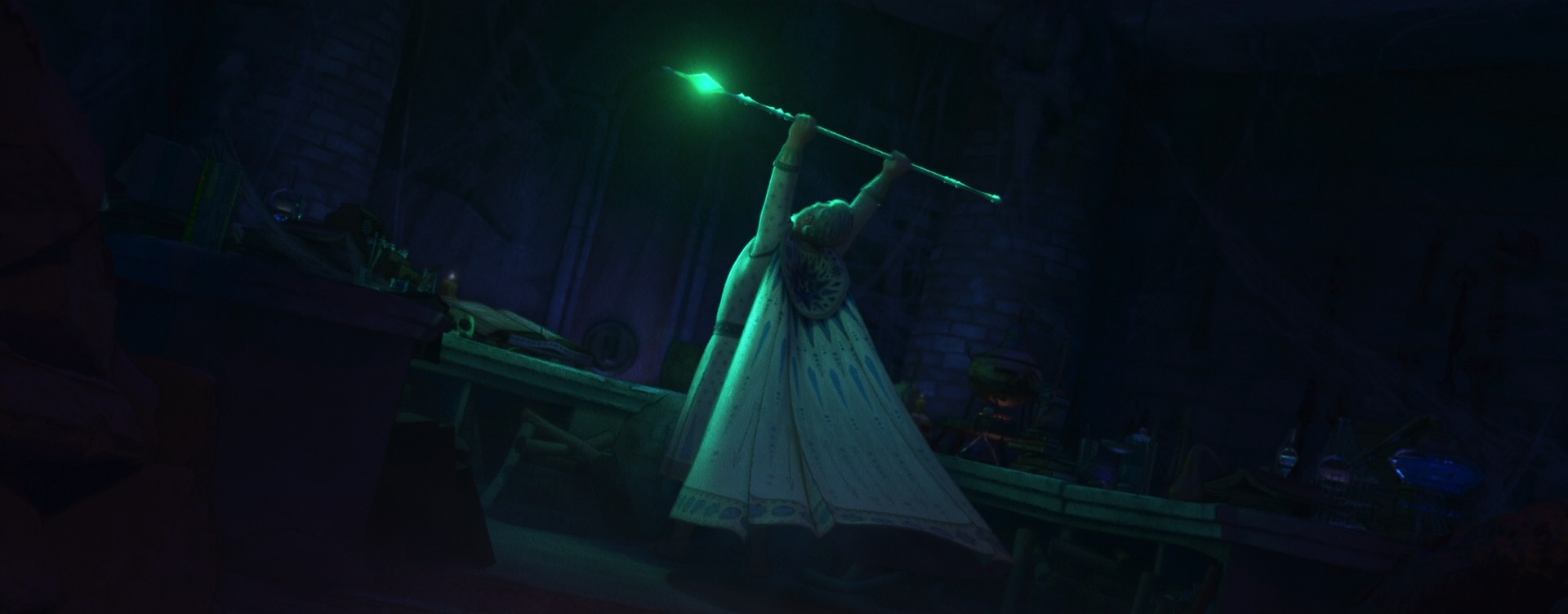 Speaking of 2D drawovers, one particularly interesting use of 2D drawings to art-direct stylization on Wish is in Magnifico’s magic and in various effects like flames and torches. Normal volumetric effects created from simulations tend to be highly physical and detailed, but Wish’s style called for these effects to harken back to the much more graphic shape language of magic effects from Disney Animation’s hand-drawn era. To do this, our effects artists built on top of the neural volume style transfer work from Raya and the Last Dragon [Navarro and Rice 2021] and Strange World [Navarro 2023] to develop a new system where effects animation would begin with hand-drawn 2D elements, which were then projected and extruded into the 3D space to provide a guide for neural volume style transfer on top of volume simulations [Tollec and Navarro 2024]. The result is that Wish’s volumetric effects combine the movement and interactions of physical simulations while retaining the shape and style of traditional hand-drawn effects.