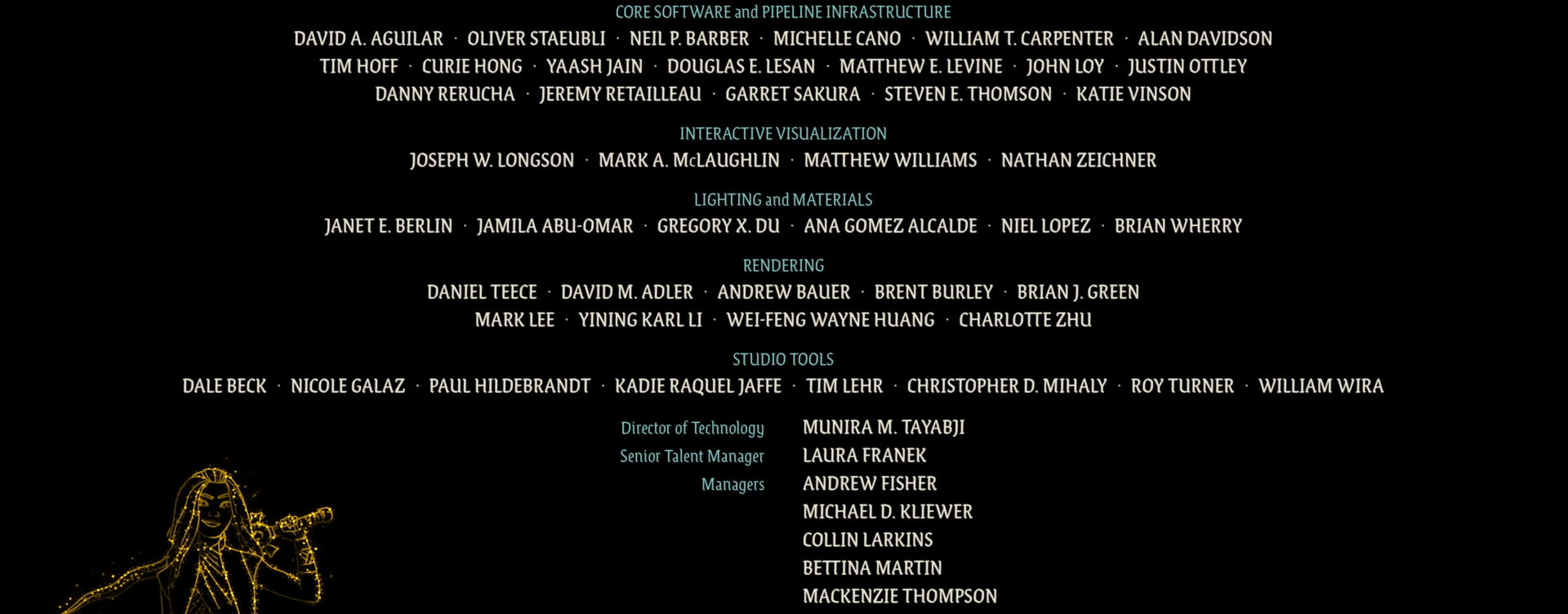 Here are two credits frames from Wish; the first is the fancy hero-credit card for my wife Harmony Li and her fellow Associate Technical Supervisors, and the second is for the Hyperion team, along with several of the Hyperion’s sister technology teams that all support lighting and lookdev. Also, Wish has a lovely post-credits scene that I’d encourage sticking around for!